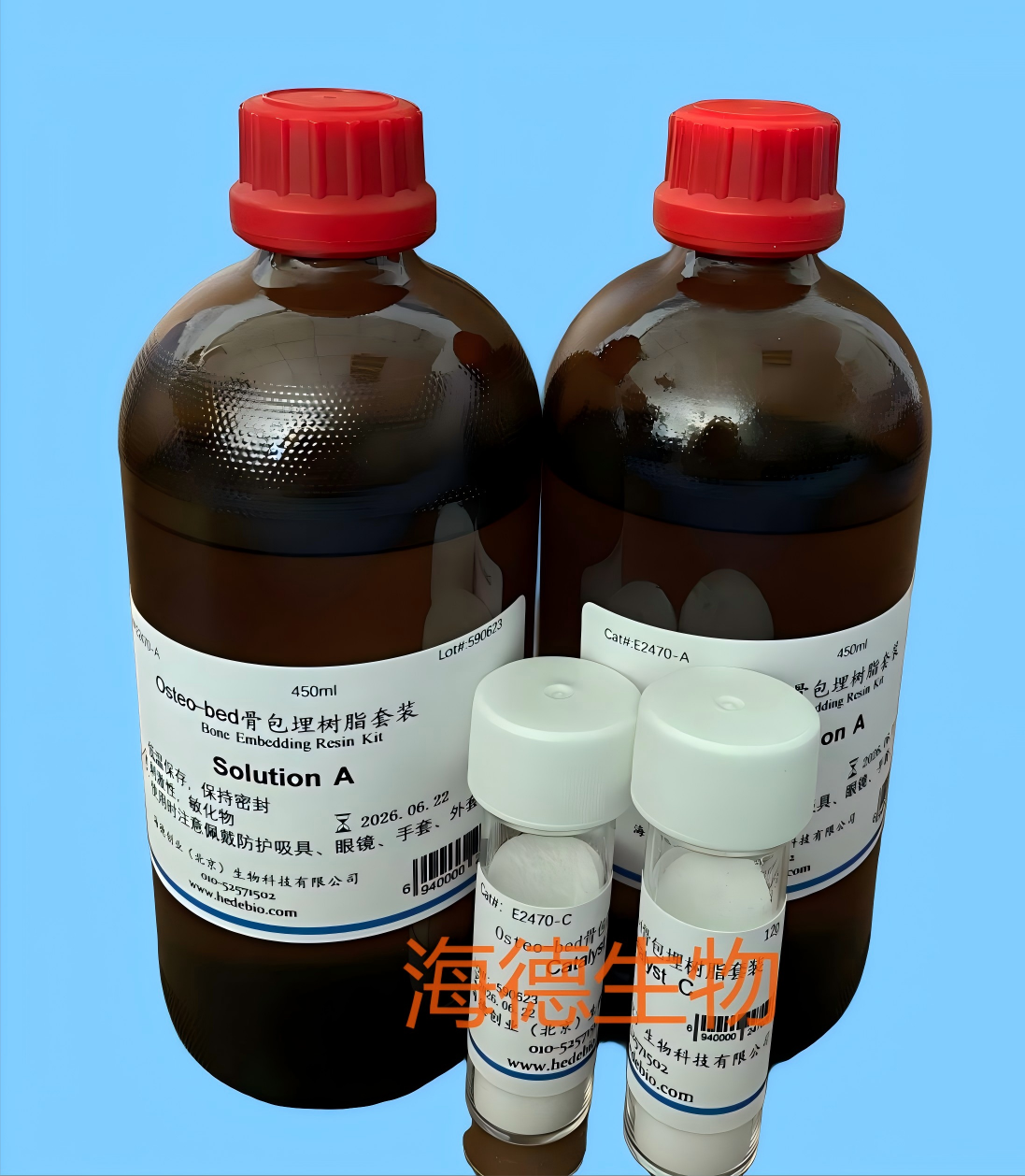 北京海德可提供兩種不同硬度的骨包埋樹脂套裝:貨號E2470和貨號E2480,均是主要以MMA樹脂為主體的聚合體系,用于未脫鈣組織的包埋切片!E2470套裝適用于骨髓活檢樣本、未脫鈣骨組織、軟組織的免疫組化研究。E2480套裝可以提供高硬度的樹脂包埋塊,更適于未脫鈣的骨組織、含有金屬種植體的骨組織、體內支架等的包埋。