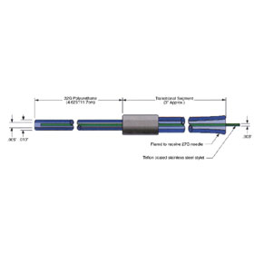 該導(dǎo)管系統(tǒng)提供最小直徑導(dǎo)管 /管芯產(chǎn)品,適用于小鼠和其它小型研究動(dòng)物的心血管、顱內(nèi)實(shí)驗(yàn)應(yīng)用。32G小鼠顱內(nèi)導(dǎo)管構(gòu)造圖見下,前端也是主要部分長(zhǎng)11.7cm,尺寸32G 的聚氨酯導(dǎo)管(0.010英寸O.D./ 0.005英寸 I.D.);緊接著后段是過渡連接區(qū)域長(zhǎng)大約7.6cm,其末端膨大為喇叭形連接口(可配套27 G 針);整個(gè)導(dǎo)管內(nèi)有一條直徑 0.003英寸 的特氟龍材料包被的不銹鋼針(鈍頭針)。該導(dǎo)管系統(tǒng)獨(dú)立包裝。