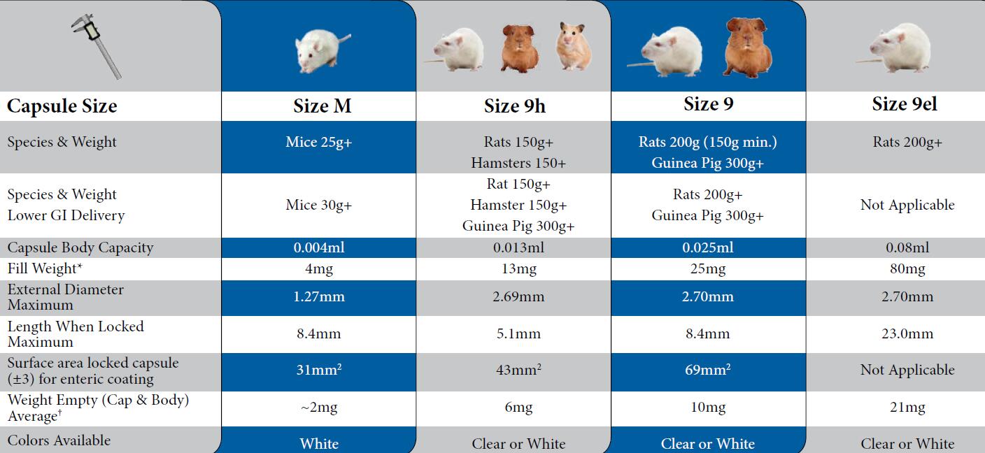 小動物專用膠囊根據(jù)使用對象的個體大小分為四個級別:9el號、9號、9H和M號。9號適用于大鼠(體重150g以上)和豚鼠;M號適用于體重大于30g的小鼠。另外,9號還適用于大鼠(200g-250g)的肛腸給藥(是不是也要考慮包衣問題?)??紤]到9el號膠囊太大,不適合腸溶,就不給出包衣的指導面積了。