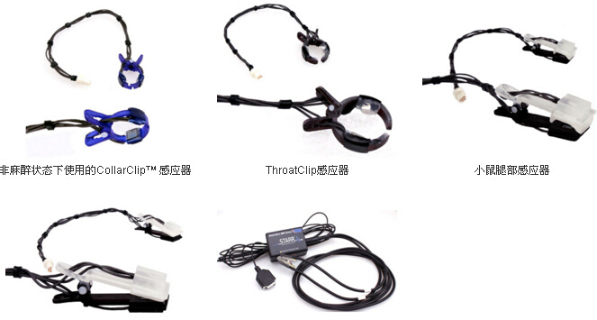 MouseOx Plus也即設(shè)備盒子,單獨(dú)這個(gè)設(shè)備并不能順利開展工作,除去必備的電腦之外,傳感器(sensor clip)是必須選擇的配件。傳感器一般通過通用纜線(Universal Cable)與設(shè)備盒子連接??筛鶕?jù)實(shí)驗(yàn)對象來選擇夾持在動物的不同體位的傳感器。