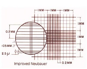 2.普通刻線型血細(xì)胞計(jì)數(shù)板(The Dark-Line Hemacytometer):改良牛鮑氏型,又稱LEVY Hemacytometer,H型凹槽形成兩個(gè)計(jì)數(shù)平臺,平臺的每一側(cè)(圖示正上面和下面)有V型槽用來滴入待測懸液。計(jì)數(shù)池深度:0.1mm。鉆石刀刻的精準(zhǔn)分隔線,特別經(jīng)久耐用,計(jì)數(shù)準(zhǔn)確。