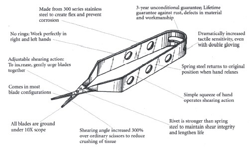 來自laschal的剪刀,其制造技術(shù)有了革命性的突破。獨(dú)特的設(shè)計(jì)使得你的使用不用區(qū)分左右手;高于普通剪刀3倍的剪切角度降低組織損傷度;刀刃使用不會(huì)變得松弛;便于拿取,無柄環(huán)狀結(jié)構(gòu);高品質(zhì),低價(jià)位;防腐蝕,防斷裂。