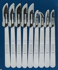 顯微外科解剖刀片,無(wú)菌獨(dú)立包裝,共有九種不同樣式,從右往左依次為10、11、12、15、20、21、22、23、24、25號(hào),滿足您不同的實(shí)驗(yàn)操作,訂購(gòu)時(shí)需要指明幾號(hào)刀片。