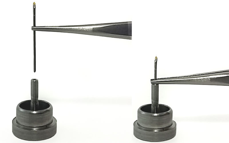 MicroMounts™裝配在一個無磁不銹鋼柱形針上,不銹鋼柱形針的直徑大約0.64mm。鋼柱長度18mm/SPINE,其它規(guī)格11mm,19mm,25mm也提供(購買時需指出)。因為鋼柱的直徑0.64,我們也可以用0.7mm的自動鉛筆來作為拿取桿子,夾取MicroMounts™需要一把尖部帶齒的鑷子。