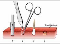 Place the punch perpendicular to the skin and apply firm and constant downward pressure with a circular twisting motion. Removal of the punch to "check the progress" should be avoided as this may result in a ragged wound and a shredded biopsy sample. A definite "give" occurs when the punch reaches the subcutaneous fat, indicating that a full-thickness cut has been made. Remove the punch and apply downward finger pressure at the sides of the wound to pop up the core. Completely elevate the core with gentle use of forceps or a needle tip and excise it at its base with small tissue scissors. The pressure applied through forceps to elevate the core should be gentle to minimize the destruction and distortion of tissue in the biopsy sample. After finishing the harvest of the tissue, prepare the biopsy site for closure