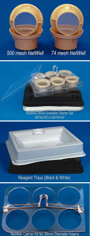 為確保實驗的快速和高效,我們?yōu)楹Y籃配套了提手及籃架(carrier kit)和試劑盤(reagent tray)。篩籃可以直接放進籃架,提到試劑盤進行固定或者染色實驗。試劑盤兩種顏色可供選擇:白色和黑色,白色試劑盤便于觀察顏色變化。黑色試劑盤便于清楚觀察切片位置。方便大家使用,我們提供以下套裝,套裝包含6個直徑24mm的netwell(或者12個直徑15mm的netwell);兩個試劑盤(一黑一白);提籃一套(carrier plate 和handle)。