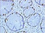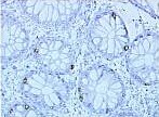 1.福爾馬林固定,石蠟包埋,人乙狀結(jié)腸組織切片,經(jīng)抗原修復(fù)鍋進(jìn)行抗原暴露,R-Buffer C (pH 6.0),組織玻片降溫過夜,抗體MIB-1,抗原Ki-67,R-Detect HRP系統(tǒng)染色