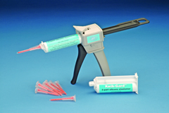 Sylgard 184硅橡膠(Kwik-Gard™Start Up kit)特別適合科學(xué)研究應(yīng)用。可以省去混合兩種膠帶來的麻煩和時間的浪費。當(dāng)推進注射器時自動在尖部混合,無任何氣泡,直接用于位點。更換尖端就可以重復(fù)使用,有效避免了浪費。每針筒含有37ml的硅膠樹脂和固化劑,針筒頭(tip)的體積0.75ml。針筒內(nèi)的硅橡膠是Sylgard 184,液體組分組成的雙組分產(chǎn)品,包括硅膠組分與固化劑。硅膠組分與固化劑按10:1重量比完全混合,形成中等粘度混合液,混合液將固化成為具有韌性的透明彈性體,硅橡膠在25℃的溫度固化需要24h,無放熱現(xiàn)象,無需二次固化。