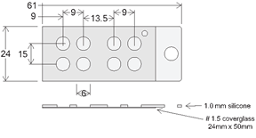 產(chǎn)品由兩部分構(gòu)成:24 mm x 50 mm, #1.5 德國玻璃蓋玻片;可重復(fù)應(yīng)用的無細(xì)胞毒性的硅膠隔離貼片。