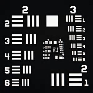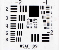 美國空軍1951年分辨力測試圖一直是世界上檢測垂直與水平分辨力的通用標準,是符合MIL-STD-150A標準的分辨力測試圖案,由美國空軍于1951年創(chuàng)建。1951 USAF分辨力測試圖目前仍廣泛地應(yīng)用于測試光學(xué)成像系統(tǒng)(如顯微鏡和相機)的分辨能力。這種圖案包括幾組由三條短線構(gòu)成組合,短線的尺寸從大到小。成像系統(tǒng)無法辯明的最大短線組為其分辨能力極限。