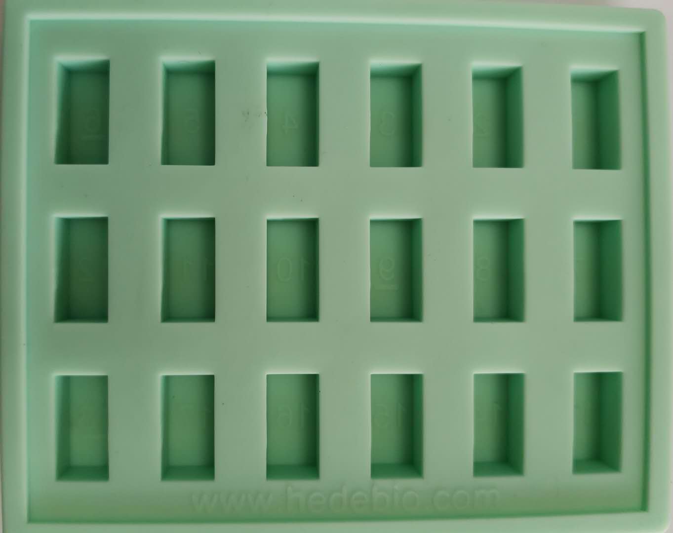 淡綠色的18槽硅膠模具,長寬為130×100mm,槽大小為20×10,10mm,可以與骨髓塑料切片試劑盒配套使用,也可以用于JB-4等樹脂包埋。